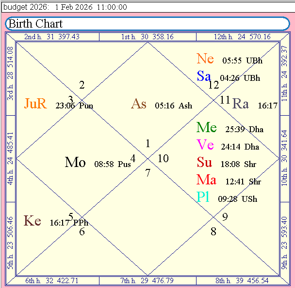 India’s natal chart or horoscope has a Taurus Ascendant (Vrishabha Lagna). But when the Budget Speech commences, the rising sign will be an Aries Ascendant (Vyaya Bhava or the House of Expenditures). Meanwhile, Saturn will be transiting with the Ascendant, and the Moon will be in the Saturn constellation (Nakshatra). This implies that when the budget is good, the Finance Minister’s performance may not get full recognition.