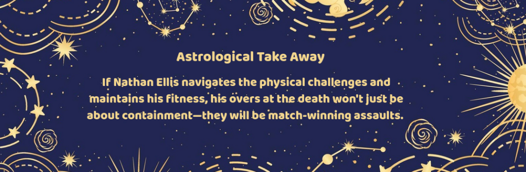 Nathan Ellis’s performance is influenced by a unique alignment of the Sun and Moon, which blends leadership with calm, and a Mercury-Mars connection that enhances his tactical skills. However, tough transits involving Saturn and Rahu pose injury risks.